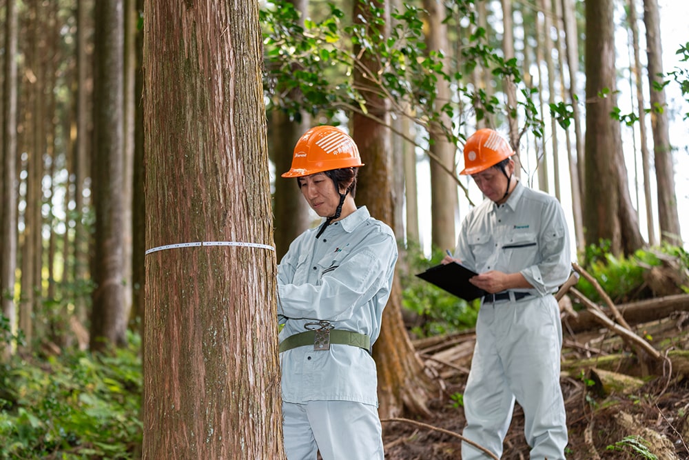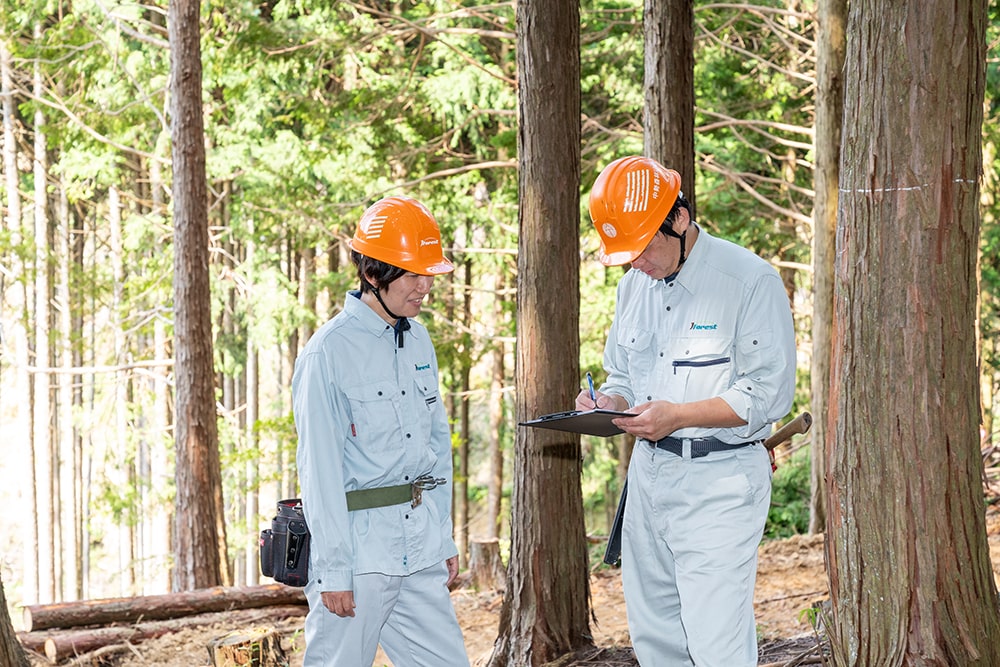 企画課の課長である赤野充典さんと共に、状況確認を行う山田さん。立木の価格を決める材積計算について、この現場では航空レーザで測ったデータとの誤差がないかを調べています。病害虫による被害や腐れ、木の曲がりなど目視でないとわかりにくい部分もしっかり確認します。